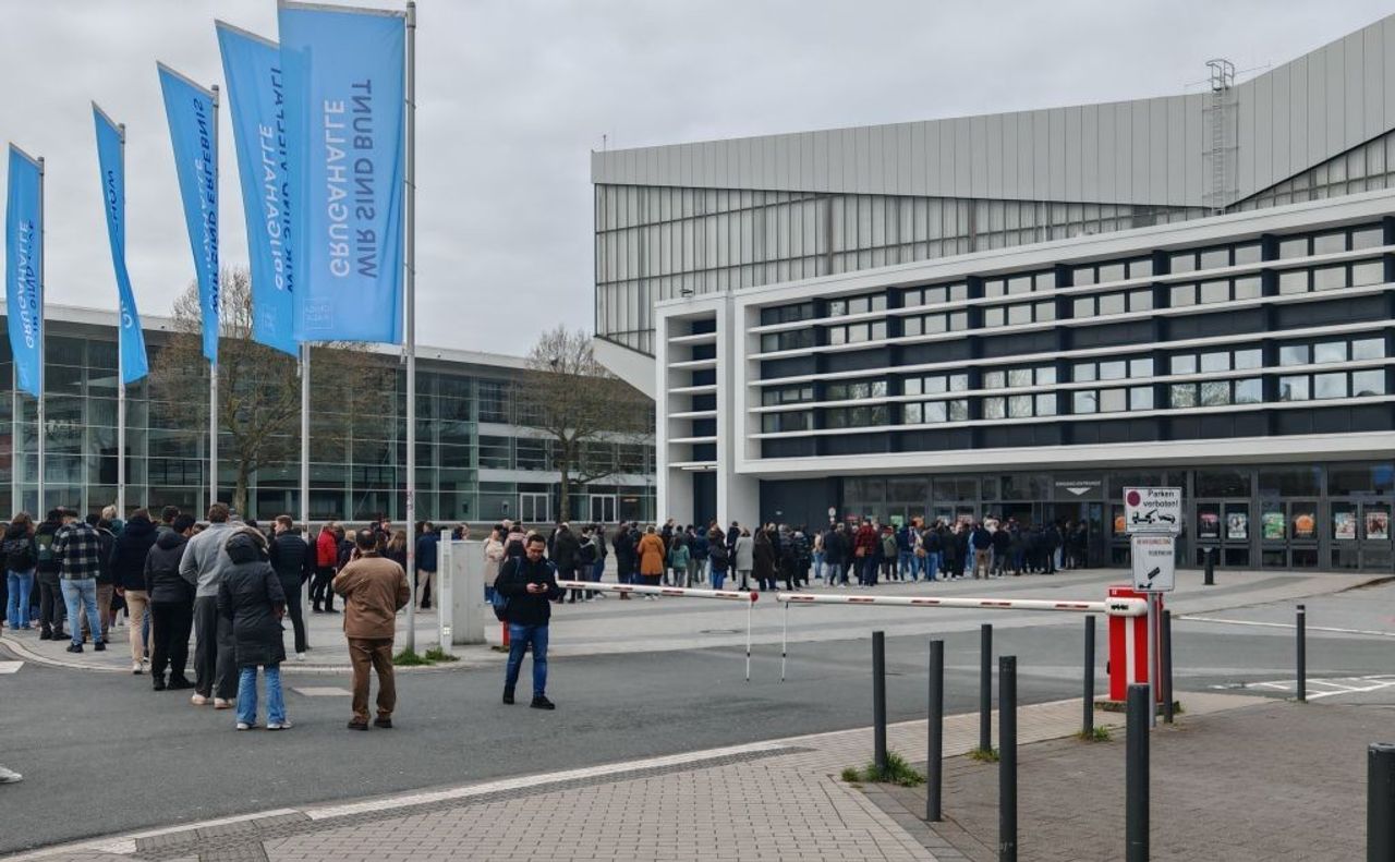 Beschäftigte der IT-Firma Aldi DX vor der Essener Grugahalle, 31. März 2026