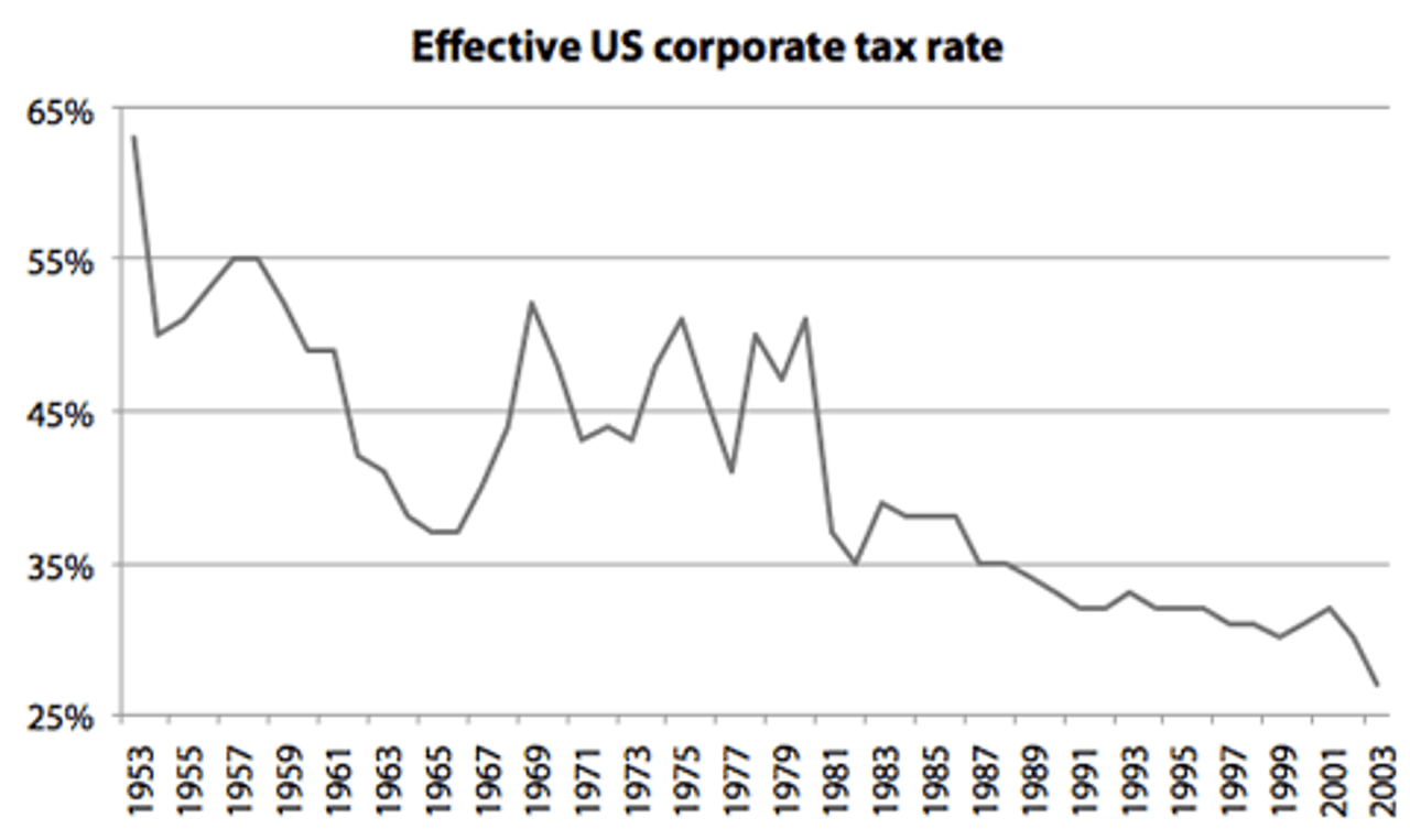 The real tax rate that corporations pay has been declining for years. In 1953, the effective corporate tax rate was 63 percent. By 2003, it had been cut by more than half, to 27 percent, according to a 2004 congressional research report.
