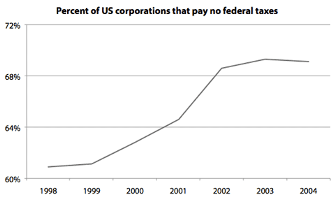 The report found that in 2003, nearly 70 percent of US corporations paid no corporate income tax. During the period of the study, which reviewed corporate tax filings between 1998 and 2005, there was a significant increase in the percentage of companies that reported no income taxes, from 60.9 percent in 1998 to 66.7 in 2005.