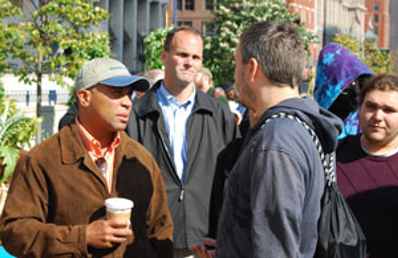 Deval Patrick (left) speaking with Occupy Boston organizers
