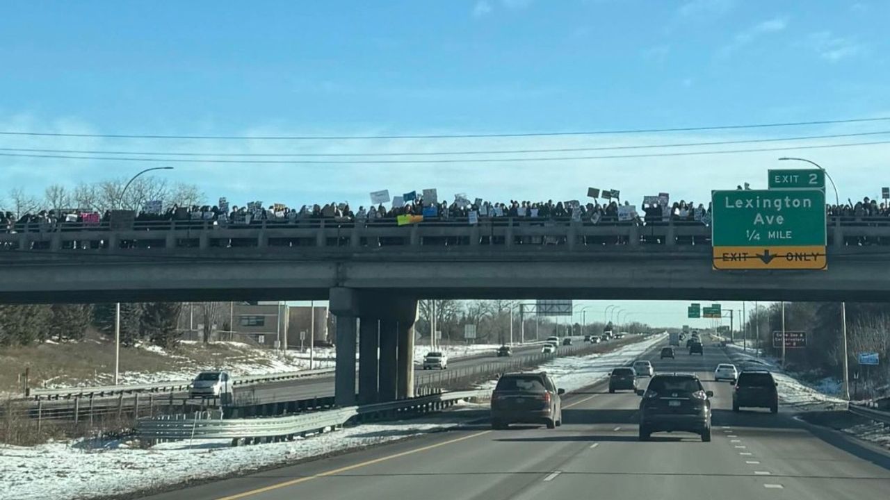 Des centaines d’élèves de l’école secondaire régionale de Roseville ont marché lors d’une manifestation sur le pont piétonnier de Hamline Avenue. Les photos de l’événement montrent les élèves massés sur le pont, brandissant des pancartes contre l’ICE et réclamant justice pour Renee Good.