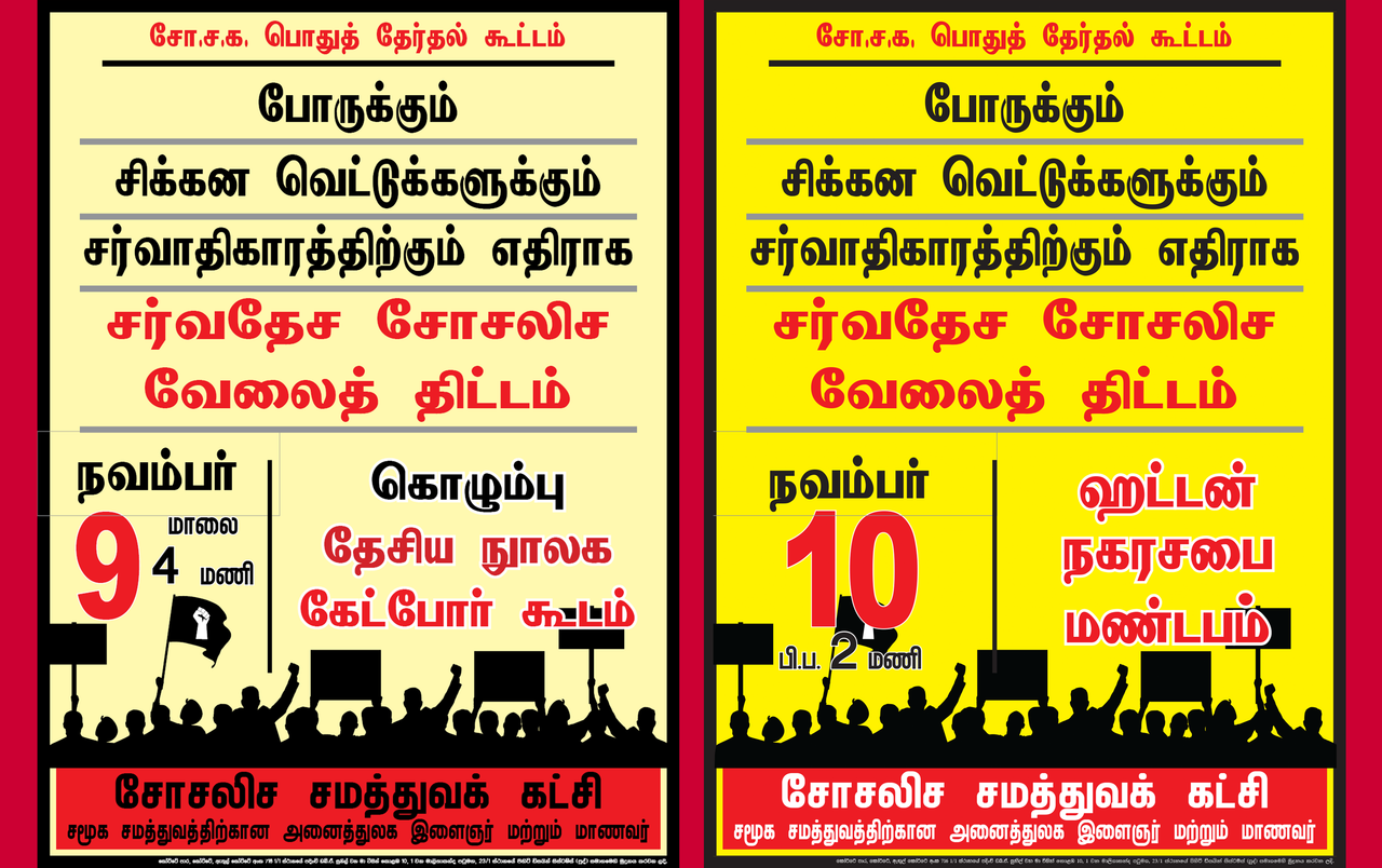 சோசலிச சமத்துவக் கட்சியும், சமூக சமத்துவத்திற்கான அனைத்துலக இளைஞர் மற்றும் மாணவர் அமைப்பும் நவம்பர் 14 நடக்கவுள்ள பொதுத் தேர்தலுக்கான அதன் பிரச்சாரத்தின் இறுதி கூட்டங்களை நவம்பர் 9 அன்று கொழும்பில் தேசிய நூலக கேட்போர் கூடத்திலும், நவம்பர் 10 அன்று ஹட்டன் நகரசபை மண்டபத்திலும் நடத்தவுள்ளன.